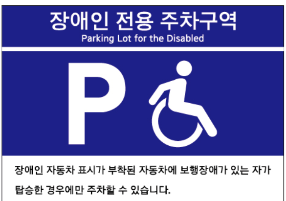 표지판에 이 사항은 적혀져 있습니다. '장애인자동차표지가 부착된 자동차에 보행상장애가 있는 자가 탑승한 경우에 주차할 수 있습니다' 이를 위반할 경우 과태료를 부과하게 됩니다.