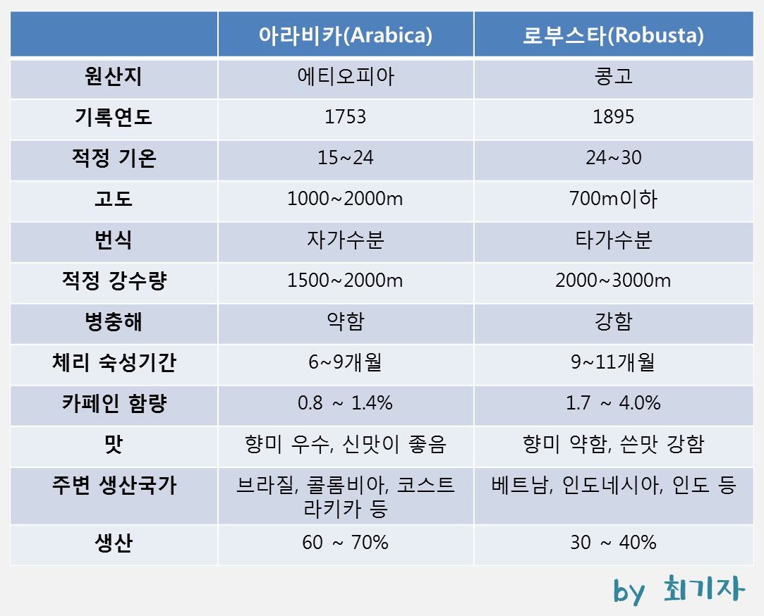 그럼 아래의 표를 보고 아라비카와 로부스타의 특성을 비교해보자.