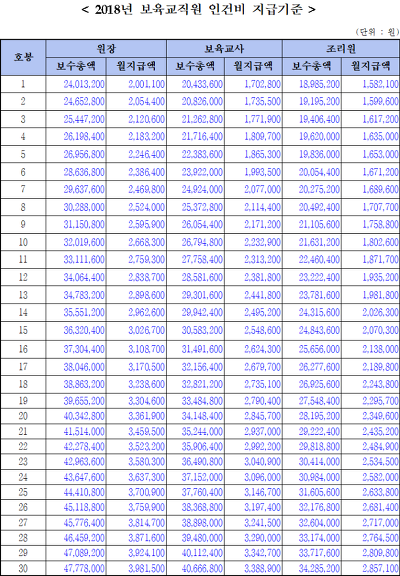 위에 표에서 보육교사 라인을 참고해서 보면 유치원 교사 월급을 알 수 있습니다. 유치원 교사는 호봉제라서 1호봉 교사가 연봉 2,000정도 됩니다. 30호봉을 채우면 4,000만원 정도의 연봉을 받을 수 있습니다.